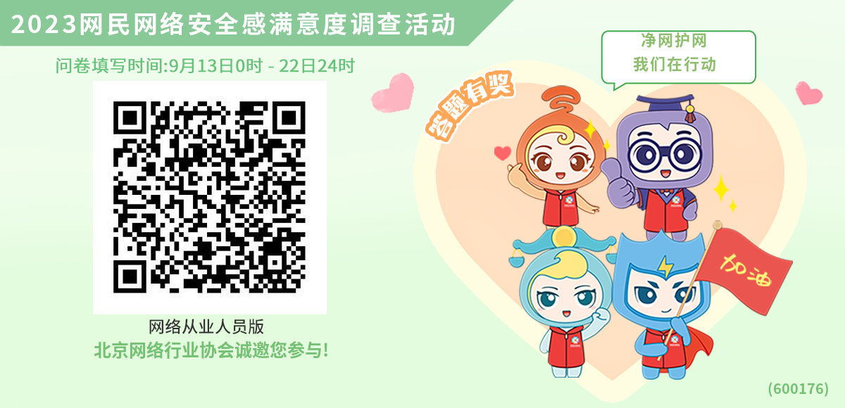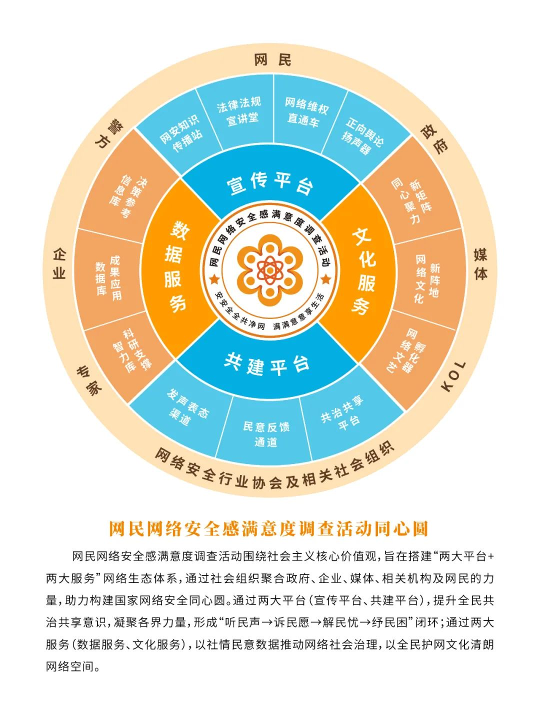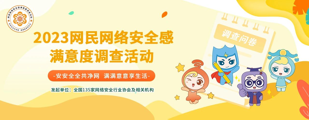 ? ? “網民網絡安全感滿意度調查活動”是一個全國性、公益性網絡安全社會調查活動,自2018年開始每年舉辦一屆。活動采取線上問卷調查方式開展,網民群眾可在每年10天的樣本采集期間通過參與答卷,反映上網用網的感受、評價、建議及意見,是廣大網民表達訴求、意見、建議的綠色通道。2023年調查活動由北京網絡行業協會全國135家網絡安全行業協會及相關機構共同發起,全國各地各級相關部門、企業、公益組織、科研機構、媒體支持,緊跟社會時勢,聚焦民生熱點。